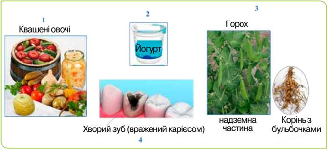 Існують бактерії, завдяки життєдіяльності яких молоко перетворюється на кефір, сметану, сир. Йогурт, деякі сорти сиру та інші кисломолочні продукти, квашені овочі й фрукти, які споживає сучасна людина, — теж результат «роботи» бактерій (мал. 1 і 2 у колажі на початку параграфа та мал. 72).