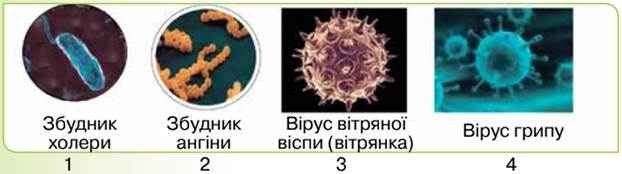 Мал. 73. Приклади збудників хвороб: бактерій (1, 2) і вірусів (3, 4)