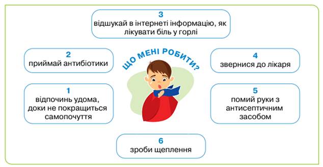 Обговоріть ситуацію. Хлопчик поскаржився друзям, що відчуває слабкість і біль у горлі. Поради, які дали друзі, на колажі.