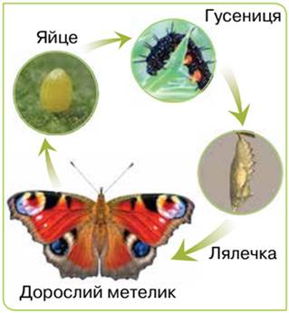Новонароджене потомство метеликів і жаб зовсім не схоже на батьків. Перш ніж стати схожим на батьків, воно зазнає чимало змін. Малюнок 79 знайомить з розвитком метелика павичеве око.