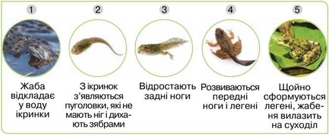 Жаби мешкають у воді й на суходолі, a-от їх розмноження і розвиток відбувається лише у воді. З ікринки з’являється пуголовок, який нагадує маленьку рибку з великим хвостом (мал. 80). Пуголовок живиться інфузоріями та іншими мікроскопічними організмами, швидко росте й змінюється.