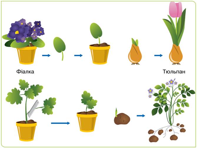 Рослини здатні розмножуватися частинами свого тіла (мал. 78). За такого розмноження з частини батьківського організму (наприклад, листка, стебла, цибулини, бульби) утворюється новий організм. Він успадковує всі ознаки батьківського організму, тобто є його копією.