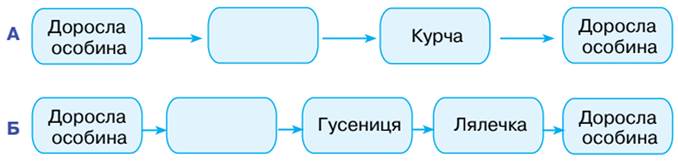 3. Установи правильну послідовність розвитку курки (А) й метелика (Б). Що необхідно помістити в порожню комірку?