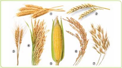 Мал. 86. Зернові культурні рослини: 1-2 — пшениця; 3 — ячмінь; 4 — просо; 5 — кукурудза; 6 — рис; 7 — овес