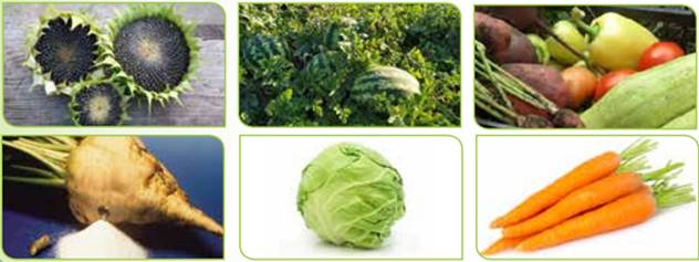 Крім зернових рослин вирощують олійні (соняшник), технічні (цукровий буряк), овочі (помідори, огірки, кабачки, цибулю, перець) та деякі інші (колаж).