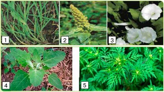 Мал. 87. Поширені бур’яни полів: 1 — пирій; 2 — щириця; 3 — берізка; 4 — лобода; 5 — амброзія
