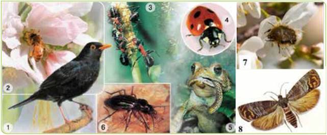 Мал. 89. Тварини саду: 1 — дрізд; 2 — бджола; 3 — мурашки; 4 — сонечко; 5 — ропуха; 6 — турун; 7 — бронзівка волохата; 8 — яблунева плодожерка