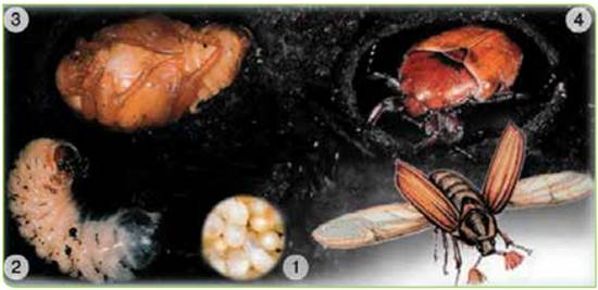 Мал. 90. Розвиток хруща: 1 — яйця; 2 — личинка; 3 — лялечка; 4 — доросла комаха