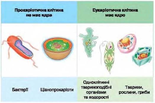 • Я знаю, чим відрізняються два основних типи клітин живих організмів — прокаріотичний та еукаріотичний, і вмію ці типи розрізняти за зображаннями або мікрофотографіями.