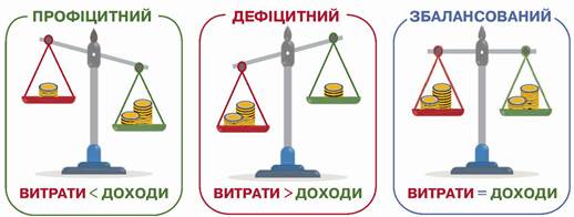 За рівнем збалансованості виділяють три види родинного бюджету: профіцитний (коли доходи є вищими порівняно з витратами), збалансований (доходи і витрати є рівними за обсягами) і дефіцитний (коли витрати перевищують доходи) (рис. 37).