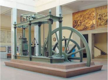 Роздивіться світлину. На ній зображено модель парової машини, яку 1776 р. створив шотландець Джеймс Ватт. Парова машина працювала на вугіллі, що дозволяло зменшити залежність виробництва від водяних млинів та інших природних джерел енергії. Поміркуйте, як винайдення парового двигуна вплинуло на розвиток промисловості та інші сфери життєдіяльності людини.