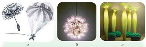 Роздивіться зображення насіння кульбаби (мал. 146, а, зліва). Проаналізуйте вигляд виробів, спроектованих із запозиченням форми та принципів життєдіяльності цієї рослини. Запропонуйте власний варіант використання форми насіння кульбаби для проектування виробу.