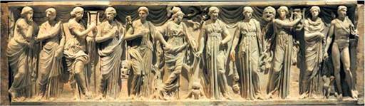 Аполлон, Афіна і дев'ять муз на рельєфі саркофага