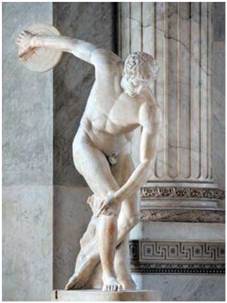 Давньогрецькі скульптори досягли вершин у переданні рухів людини. Відомий «Дискобол» — перша класична скульптура, що зображує людину в складному русі, у повороті. Оригінал «Дискобола», який вважають роботою скульптора Мірона, не зберігся, але він представлений римськими копіями (бронзовими й мармуровими).