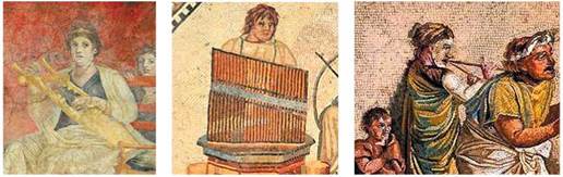 Римські фрески й мозаїки із зображеннями виконавців з музичними інструментами: кіфара, гідравлос, авлос