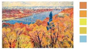Осінній краєвид сліпить золотом і багрянцем, зачаровує теплою кольоровою гамою. Земля на зимових пейзажах вкрита блакитно-білою сніговою ковдрою, дерева, прикрашені інеєм, виблискують сріблясто-сліпучими тонами.