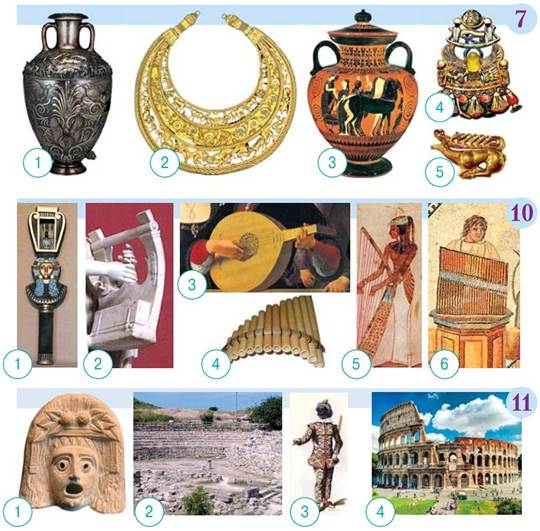 11. Які ілюстрації репрезентують театр античності, а які — Русі-України?