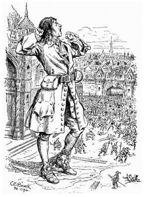 ...Імператор верхи наближався до мене. Цим він наражав себе на смертельну небезпеку, бо хоч як добре був вимуштруваний його кінь, та, побачивши таку величезну постать, що здалася йому живою горою, він злякався і став дибки. На щастя, імператор був чудовим вершником і всидів у сідлі, аж поки підбігли придворні.