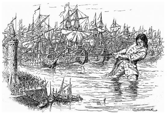 Імперія Блефуску — це острів, розташований на північний схід од Ліліпутії і відокремлений від неї лише протокою у вісімсот ярдів завширшки. Я ще не бачив цього острова, а довідавшись про запланований напад, уникав показуватись на березі, щоб мене не помітили з якогось ворожого корабля; в Блефуску про мене нічого не знали. Я доповів його величності про свій план захоплення ворожого флоту, що стояв тоді, як доповідали наші розвідники, у гавані, готовий вийти в море при першому попутному вітрі. Я пішов на північно-східний берег, звідки видно було Блефуску, ліг за горбком і, глянувши в свою кишенькову підзорну трубу, побачив з півсотні військових кораблів і велику силу транспортів, що стояли на якорях. Повернувшись додому, я звелів приставити мені звій найміцнішого каната та багато залізних брусів. Канат був з нашу шворку завгрубшки, а бруси — із прутик для плетіння завбільшки. Я сплів канат утроє, щоб зробити його міцнішим, і з тією ж метою поскручував докупи по три залізні прутики, загнувши їхні кінці гачками. Причепивши п’ятдесят таких гачків до п’ятдесяти канатів, я знову подався на північно-східний берег. Там я скинув камзол, черевики і ввійшов у воду. Спочатку я йшов убрід так швидко, як тільки міг, а посередині проплив ярдів з тридцять, доки опинився на мілині; менш як за півгодини я дійшов до флоту. Побачивши мене, вороги так перелякалися, що пострибали в море і вплав дісталися до берега, де їх зібралося не менше як тридцять тисяч. Тоді я взяв своє знаряддя, позачіпав гачки за отвори, що були в носі кожного корабля, а шворки від них зв’язав докупи. Поки я порався з цим, вороги пускали тисячі стріл, і багато з них впиналися мені в руки та обличчя, завдаючи пекучого болю й заважаючи працювати. Та найдужче боявся я за очі, і я напевне втратив би їх, якби не згадав про окуляри. Я видобув їх, якнайміцніше приладнав на носі і знову взявся до роботи, не зважаючи на ворожі стріли; багато їх влучили в скельця окулярів. Позачіпавши кораблі гачками і взявшись за зв’язані вузлом шворки, я перерізав ножем якірні канати; потім легко потяг за собою п’ятдесят найбільших ворожих військових кораблів.