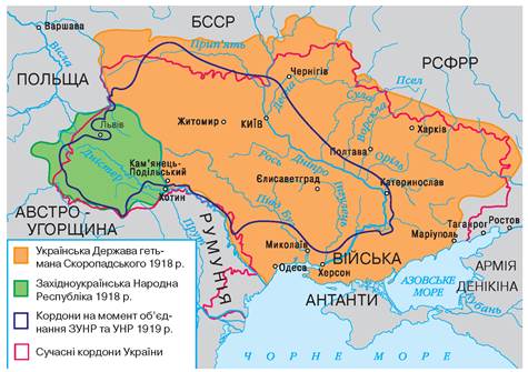 • >Уважно розгляньте карту. Порівняйте території УНР і ЗУНР та території під контролем української влади в день об’єднання держав. Чи відповідала дійсність прагненням українців?>