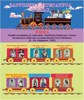 До підручника створено спеціальну онлайн-платформу «ЕММА» (у вільному доступі), яка допоможе вам доповнити уявлення про літературу за допомогою цифрових ресурсів (е-хрестоматія, авдіохрестоматія, відеохрестоматія, мультимедійні презентації, експрес-уроки, літературні ігри, вправи для перевірки знань і вмінь тощо). Їх можна легко знайти або на сайті, або скориставшись QR-кодами (що є в підручнику), використовувати як для дистанційного (онлайн), так і недистанційного (офлайн) навчання, для роботи на уроках і виконання домашніх завдань. Весела і добра «ЕММА» завжди прийде на допомогу! А ще з нею дуже захопливо мандрувати різними країнами і знайомитися із цікавими людьми та книжками!
