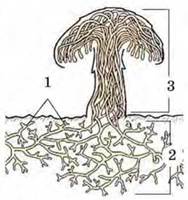 Мал. 204. Схема будови печериці: 1 - гіфи; 2 - міцелій, 3 - плодове тіло