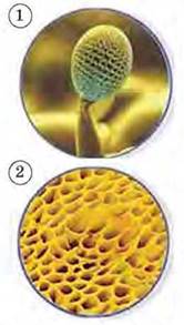 Мал. 205. Структури грибів, у яких утворюються спори: 1 - цвілевого одноклітинного гриба мукора; 2 - нижній трубчастий шар шапинки гриба