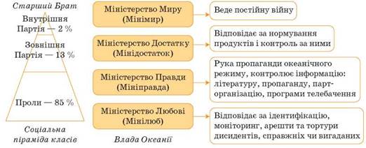 - 4. Які обов'язки виконує Міністерство Правди й Міністерство Любові?