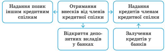 Кредитна спілка здійснює таку діяльність: приймає вступні й інші внески від членів спілки; надає кредити своїм членам на умовах платності, строковості та забезпеченості; залучає на договірних умовах внески своїх членів на депозитні вклади; виступає поручителем виконання членом спілки зобов’язань перед іншими особами; розміщує тимчасово вільні гроші на депозитних вкладах у банках; залучає кредити банків для надання кредитів своїм членам; позичає гроші іншим кредитним спілкам; займається благодійництвом.