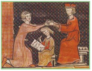 Церемонія васальної клятви. Середньовічна мініатюра