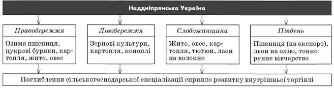 • Наддніпрянщина забезпечувала 78 % пшениці та 55 % вовни, які експортувалися з імперії (від загального обсягу)