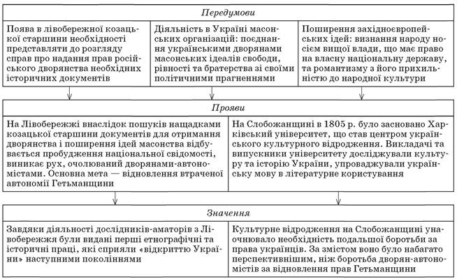 • У 20—40-х рр. XIX ст. відбувається поступовий перехід від збирання матеріалів, що підтверджують існування українського народу, до їх трансформації у певну систему ідей. Розгортається боротьба української інтелігенції за розширення сфери вжитку української мови. Діяльність літературного гуртка «харківських романтиків», очолюваного І. Срезневським. Видання ним «Українського альманаха» (1831), шести випусків фольклорно-етнографічної збірки «Запорожская старина» (1833—1838) • У 30-х рр. XIX ст. українські літературні гуртки з’являються у Петербурзі та Москві. 1841 р. у Петербурзі вийшов альманах «Ластівка», у якому всі твори вперше були написані українською мовою • У середині 40-х рр. XIX ст. навколо Київського університету формується новий осередок українського літературно-наукового життя. Створення на початку січня 1846 р. Кирило-Мефодіївського братства |