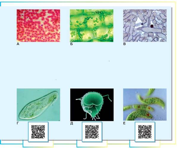 А. Еритроцити жаби. На відміну від еритроцитів ссавців, вони містять ядро. Б. Клітини листка. Видно численні зелені хлоропласти, а клітини оточені потужними целюлозними клітинними стінками. В. Переріз плодового тіла шапинкового гриба. Плодове тіло утворене щільною сіткою переплетених ниток — гіф, побудованих із клітин, укритих клітинною стінкою. Невеличкий за обсягом простір між гіфами заповнений повітрям. Г. Інфузорія. Д. Лямблія. Е. Евглена зелена.