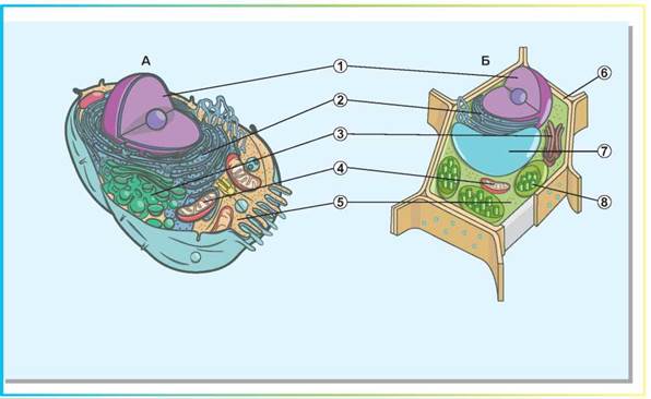 Рис. 13.2. Будова тваринної (А) та рослинної (Б) клітин
