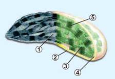 Ліва частина зображення є світлиною, що зроблена за допомогою електронного мікроскопа, права частина — малюнок, створений художником. 1. Строма. 2. Зовнішня мембрана. 3. Тилакоїд. 4. Внутрішня мембрана. 5. Ґрана.