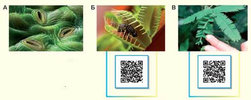 А. Продихи. Б. Листки венериної мухоловки. В. Листки мімози сором’язливої.