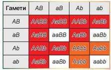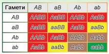 А тепер розглянемо, які розщеплення матимемо у випадку схрещування двох чистих ліній: ААВВ и aabb. Та перш ніж приступати до розгляду, зауважимо, що ми розглядаємо незалежне успадкування обох генів. Таким чином, розподіл генотипів збігатиметься з таким розподілом для дигібридного схрещування. Також у всіх випадках спостерігатиметься одноманітність у першому поколінні та розщеплення в другому. Розщеплення генотипів у другому поколінні буде однаковим у всіх випадках та відображатиметься на решітці Пеннета для дигібридного схрещування. Усе, що від нас треба, — розфарбувати решітку Пеннета у відповідні кольори, щоб відобразити фенотипи.