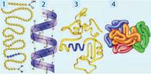 Іл. 56. Структурна організація білків: 1 — первинна структура (ланцюг); 2 — вторинна структура (спіраль); 3 — третинна структура (глобула); 4 — четвертинна структура (мультимер)