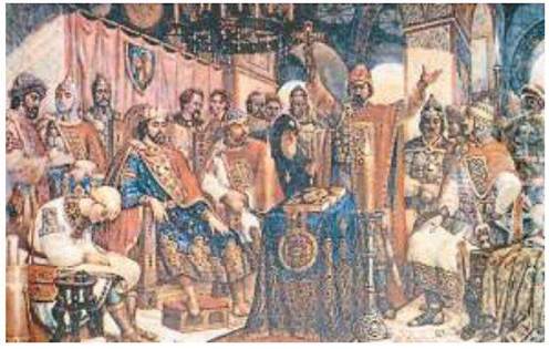 12*. Порівняйте репродукцію історичної картини П. Андрусіва «З’їзд князів» (с. 107) з літописним описом з’їзду князів. Наскільки достовірно художник відобразив цю подію?