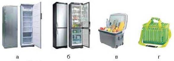 Мал. 108. Прилади для зберігання продуктів при понижених температурах: а — морозильник; б — холодильник з морозильною камерою; в — автомобільний холодильник; г — сумка-холодильник