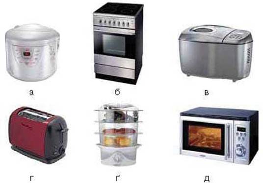 Мал. 109. Прилади для приготування їжі: а — мультиварка; б — електроплита; в — хлібопічка; г — тостер; ґ — пароварка; д — мікрохвильова піч