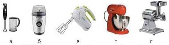 Мал. 110. Прилади для механізації кухонних робіт: а — блендер; б — кавомолка; в — міксер; г — універсальний кухонний комбайн; ґ — м'ясорубка