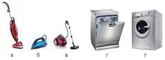 Мал. 111. Прилади для прання та догляду за житлом: а — парова швабра; б — праска; в — пилосос; г — посудомийна машина; ґ — пральна машина