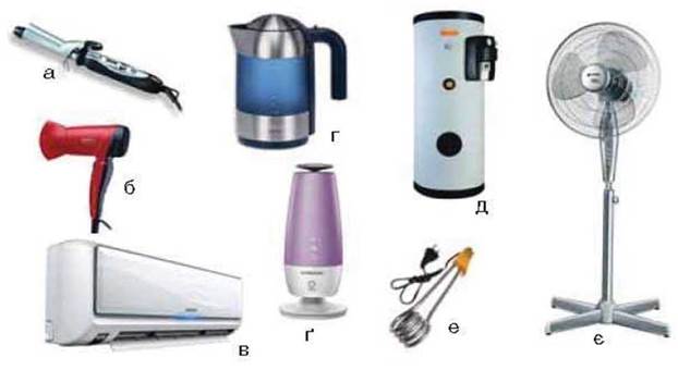Мал. 112. Прилади для особистої гігієни, нагрівання рідини та підтримки мікроклімату: а — щипці для завивки; б — фен; в — кондиціонер; г — електрочайник; ґ — іонізатор; д — бойлер; е — кип’ятильник; є — вентилятор
