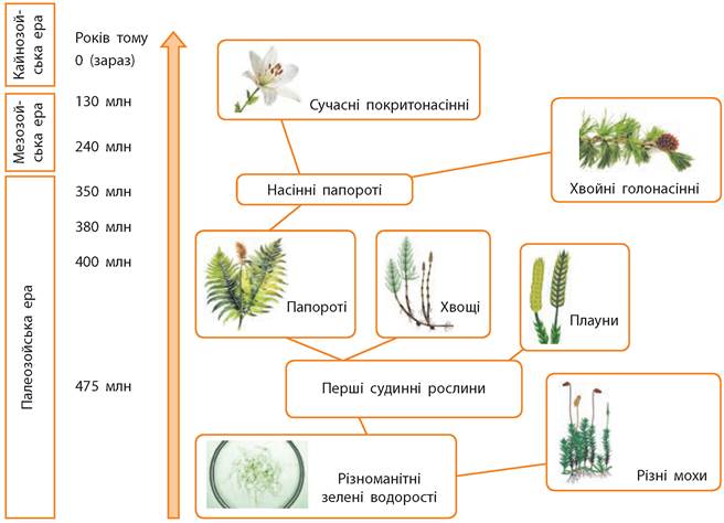 § 19. Загальний огляд еволюції рослин. Порівняння особливостей мохів, папоротей, голонасінних і покритонасінних рослин