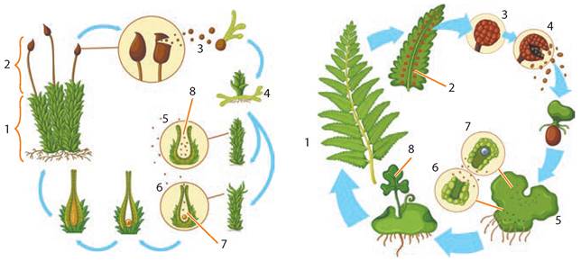 Із часом суходіл опанували древні мохи, хвощі, плауни, папороті (мал. 19.4). У життєвому циклі мохів переважає статеве покоління — гаметофіт. А в плаунів, хвощів і папоротей у життєвому циклі переважає нестатеве покоління — спорофіт, який має корені, стебло й листки.