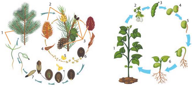 Завдання 2. Розгляньте малюнки. Порівняйте життєвий цикл голонасінних і покритонасінних рослин. Що в них схожого? Чим вони відрізняються? Запишіть назви елементів схеми, які позначені цифрами. Зробіть висновки.