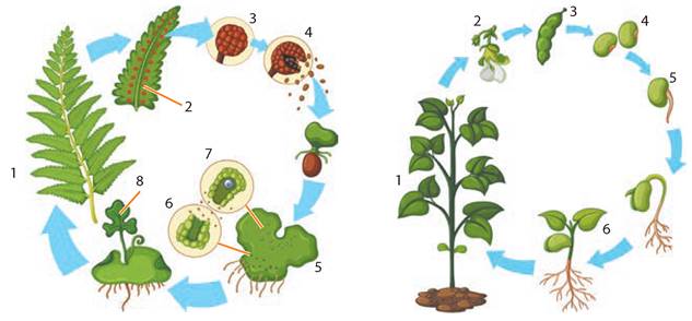 Завдання 3. Розгляньте малюнки. Порівняйте життєвий цикл папоротей і покритонасінних рослин. Що в них схожого? Чим вони відрізняються? Запишіть назви елементів схеми, які позначені цифрами. Зробіть висновки.