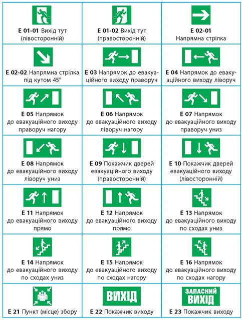 Окрім плану евакуації, існують також знаки пожежної безпеки, які підкажуть вам шляхи до порятунку або попередять про небезпеку.