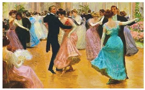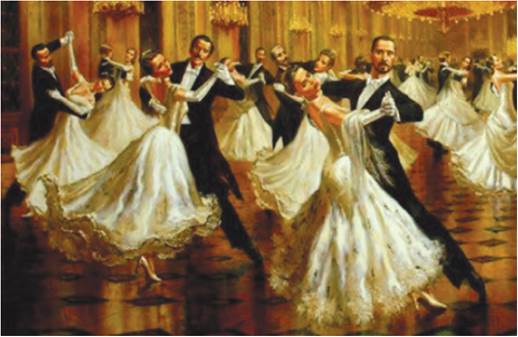 Фігури, які танцюють у живописних творах, присвячених балу, ніби злітають у повітрі, інші пари губляться в просторі залу. Увага глядачів із парадних інтер’єрів переключається на елегантність поз кавалерів і граційність дам, що вальсують. Ритм танцівників і танцівниць на картині художніми засобами відображає музичні ритми танцю.